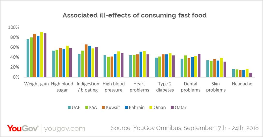Although most people in the region are aware of the ill effects from eating fast food, the consumption remains high, especially after watching these ads. Around half of the respondents pointed out bloating, indigestion and high blood sugar as some of the adverse effects of eating a lot of junk food. Over 40% of respondents associated it with more serious issues like high blood pressure (44%), type 2 diabetes (42%) and heart problems (45%).